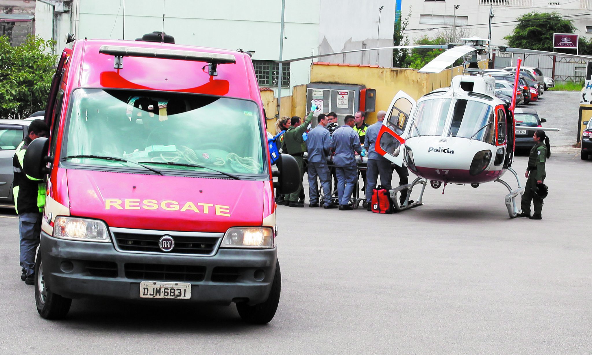 A Polícia Militar acionou o helicóptero Águia, da corporação, que pousou em um estacionamento na rua Arminda de Lima e socorreu Babberg com 95% do corpo queimado para o hospital na capital paulista.