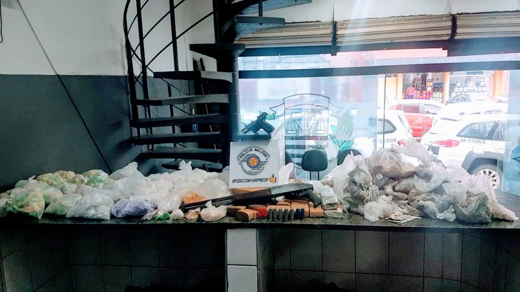 Pela rua Carlos Mariguela, os policiais localizaram uma casa com as características passadas, e ao entrar na residência, teriam sido encontrados anotações alusivas ao tráfico de drogas, além de aproximadamente 40 kg de entorpecentes entre maconha, cocaína e Skank, além de uma espingarda calibre 12 com nove munições e uma pistola com 17 munições, que constava como produto de roubo.