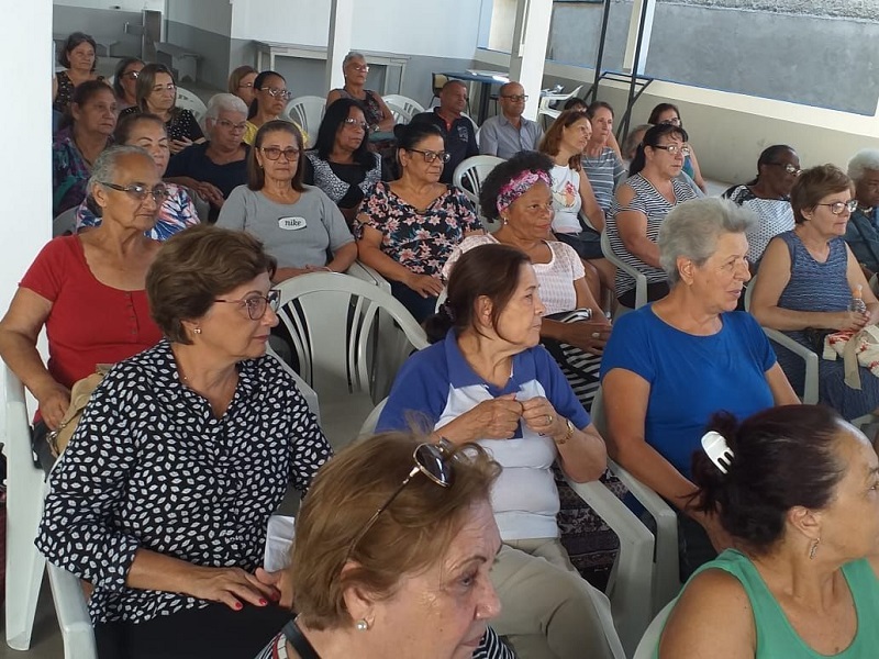 Cerca de 60 idosos participaram nesta quarta-feira, dia 17, da palestra “Como a psicologia, a nutrição e o exercício físico podem auxiliar na qualidade de vida da terceira idade”, no Centro de Convivência do Idoso (CCI) Santa Mena. O tema foi abordado por três profissionais: a psicóloga Denise Silva, a nutricionista Valéria Cuardo e pela educadora física, Marlene Prado.