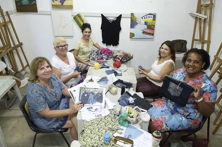 Maria Eloísa de Paula Nery, 62 anos, é uma das alunas de customização. “Gosto muito da aula porque, além de ser uma terapia, aprendo coisas novas. Estou fazendo agora uma bolsa jeans com as pernas que cortei de uma calça que não uso mais”, revela Eloísa.