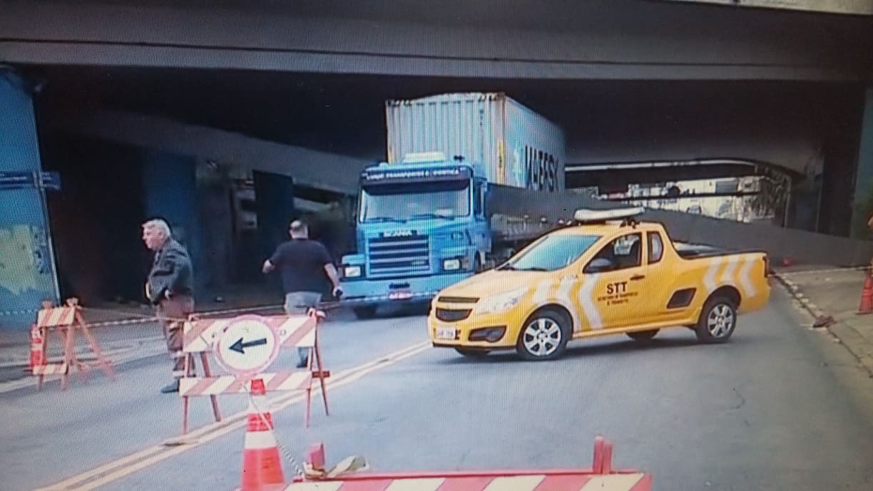 Um caminhão derrubou um pórtico, que é o limitador de altura na madrugada desta sexta-feira (03), provocando o fechamento dos dois sentidos da avenida Guarulhos, na região da Vila Itapegica, próximo ao viaduto da rodovia Presidente Dutra.