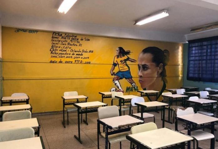 A jogadora de futebol da seleção brasileira Marta enviou um vídeo para a Escola Estadual Jurema III, em Guarulhos, agradecendo a homenagem feita a ela no ano passado. O rosto da atacante foi um dos 16 grafitados nas salas da unidade.