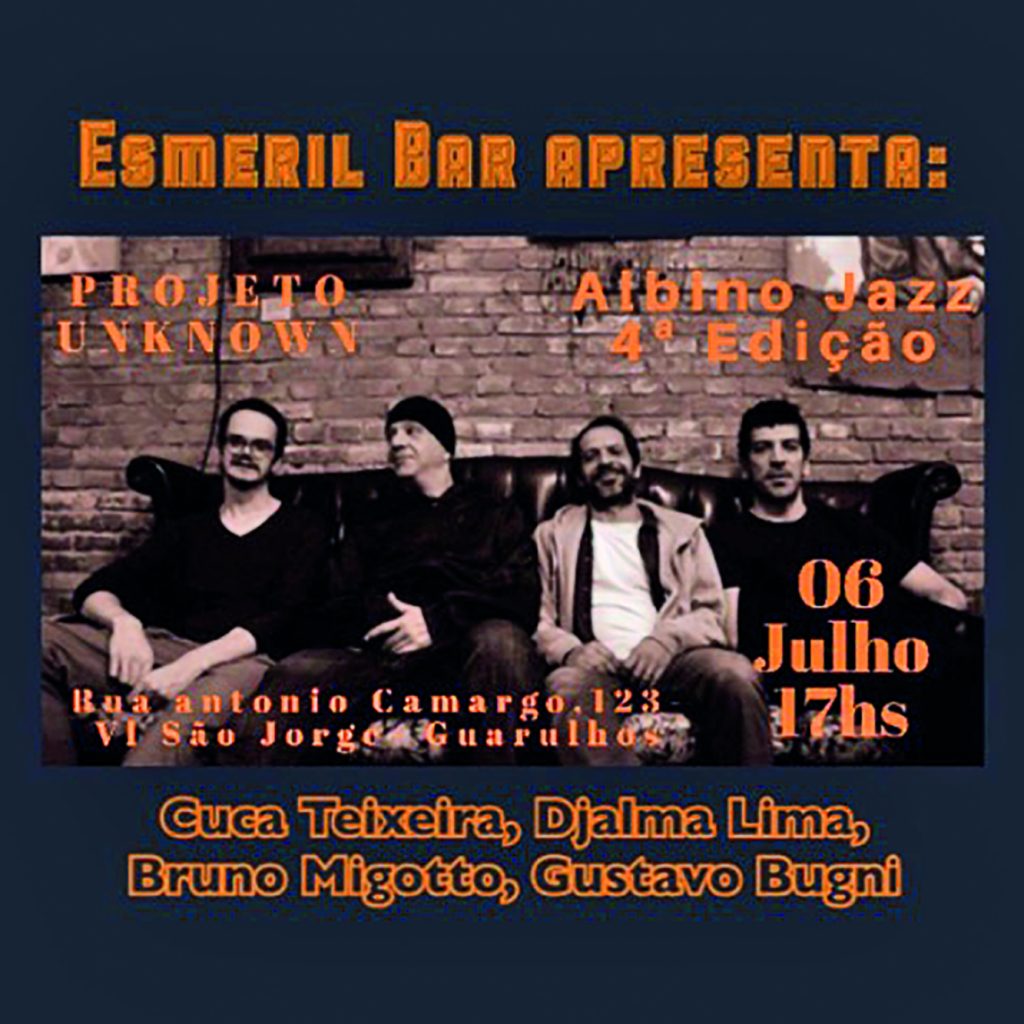 No dia 6 do mês que vem, acontece a quarta edição do Albino Jazz, apresentando o trabalho de música instrumental do Projeto Unknown. O grupo é formado por Djalma Lima (guitarra), Gustavo Bugni (piano), Bruno Migotto ( contrabaixo) e Cuca Teixeira (bateria). O evento ocorre das 15h às 23h, na rua Antônio Camargo, n° 123, no bairro Vila São Jorge.
