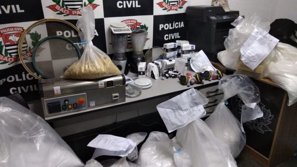 Retornando à casa, os policiais encontraram uma motocicleta entrando na residência e dois suspeitos tentando fugir. Os criminosos, incluindo o motorista do VW Gol, também foram detidos e dentro do imóvel foram encontrados diversos materiais utilizados para a fabricação de drogas, como prensas, balanças de precisão, liquidificador, peneiras, insumos, sacos plásticos, etiquetas, entre outros.