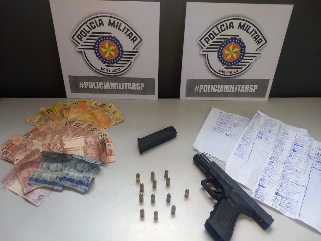 Policiais Militares da 2ª Companhia, do 31° Batalhão de Polícia Militar, surpreenderam um suspeito que estaria em posse de uma pistola Glock com 13 munições, além da quantia de R$ 650,00 em espécie e papéis de contabilidade do tráfico de drogas.