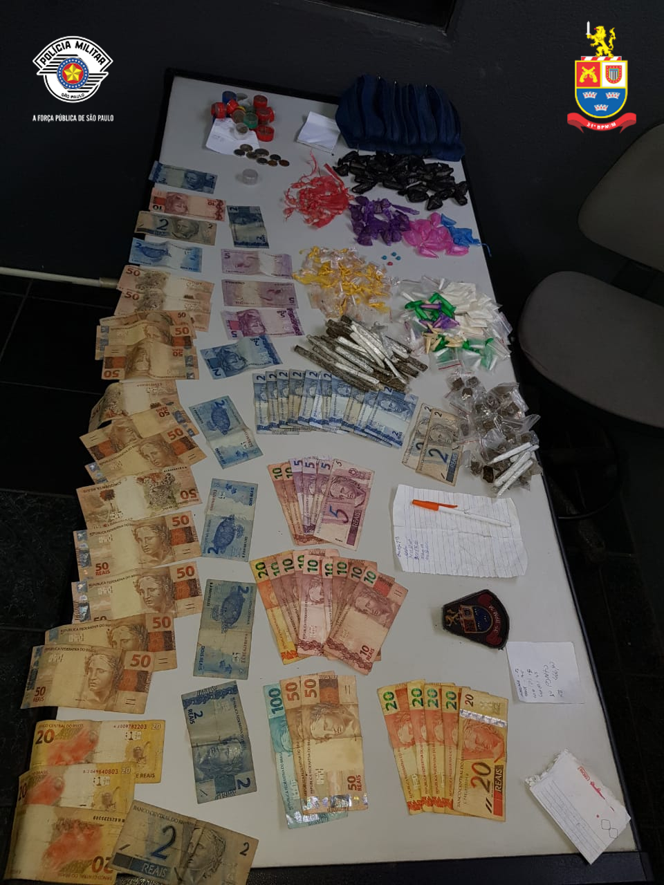 Segundo a PM, o homem baleado teria alegado que foi alvejado após ordem de traficantes por conta de uma briga. O indivíduo teria confessado que só não morreu porque conseguiu fugir do local onde seria realizado o suposto ‘Tribunal do Crime’. Com essas informações, os policiais foram até o local, na rua Biritinga, no Jardim Ponte Alta, onde em um barraco, foram detidos cinco homens que estariam em posse de entorpecentes, dinheiro e anotações do tráfico de drogas.