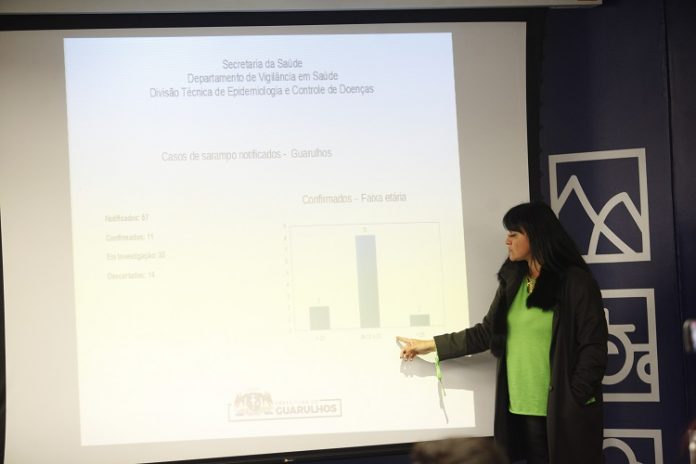A secretária de Saúde de Guarulhos, Ana Cristina Kantzos, concedeu uma coletiva de imprensa nesta quarta-feira (10) no auditório do Paço Municipal para anunciar que o governo do estado estenderá a Campanha de Vacinação contra o sarampo em Guarulhos a partir desta quinta-feira (11), com o envio de 164 mil doses da vacina ao município.