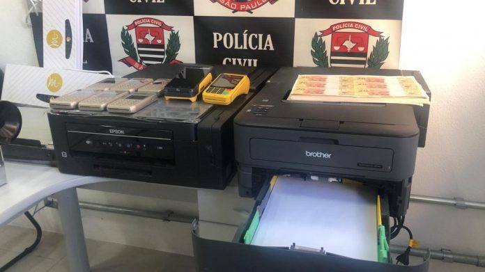 Em continuidade às investigações, a equipe localizou 77 documentos diversos, 15 cartões bancários, seis impressoras, dois notebooks, 93 folhas impressas com notas de R$ 20, bem como oito máquinas para realizar transações bancárias e sete celulares.