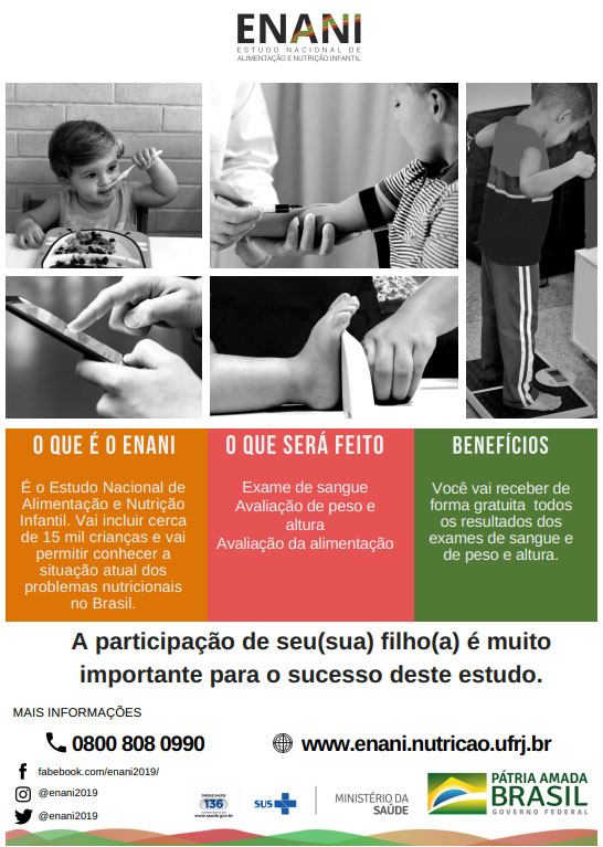 O Estudo Nacional de Alimentação e Nutrição Infantil (Enani), pesquisa da UFRJ encomendada pelo Ministério da Saúde, chega a Guarulhos. Em todo o estado de São Paulo, serão percorridos 1.530 domicílios de 14 cidades, até o final deste mês. Essa é a quinta fase do inquérito, que, pela primeira vez no país, coletará informações detalhadas sobre hábitos alimentares, peso e altura de crianças de até cinco anos. Também serão realizados exames de sangue nos participantes com mais de seis meses de vida e o mapeamento sanguíneo de 12 micronutrientes, como os minerais zinco e selênio, e vitaminas do complexo B, além de investigadas informações sobre amamentação, doação de leite humano, consumo de suplementos de vitaminas e minerais, habilidades culinárias, ambiente alimentar e condições sociais da família. Ao todo, 15 mil famílias serão visitadas pelos pesquisadores do Enani, em 123 municípios brasileiros. A Prefeitura de Guarulhos está apoiando a iniciativa através da divulgação.