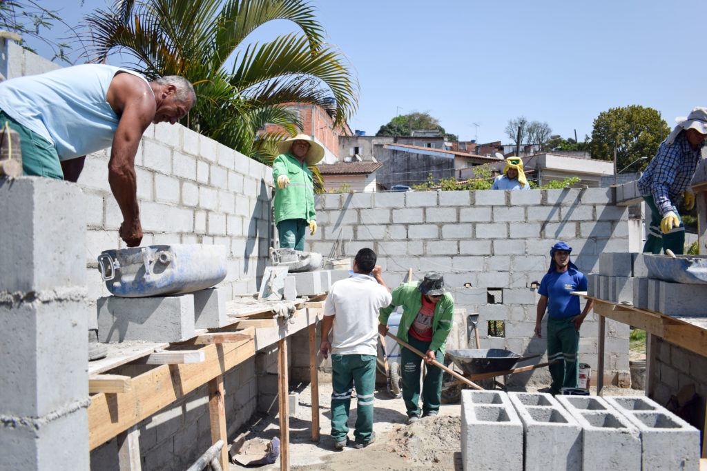 Servidores trabalham na construção de uma edificação de apoio às pessoas que atuam no local. As próximas fases da obra contemplarão a readequação do piso interno, com a construção de 104m² de baias para o recebimento de volumosos, como sofás e resíduos secos recicláveis (papel, lata, vidro e plástico), e uma baia de 24m² para caçambas estacionárias do tipo roll on.