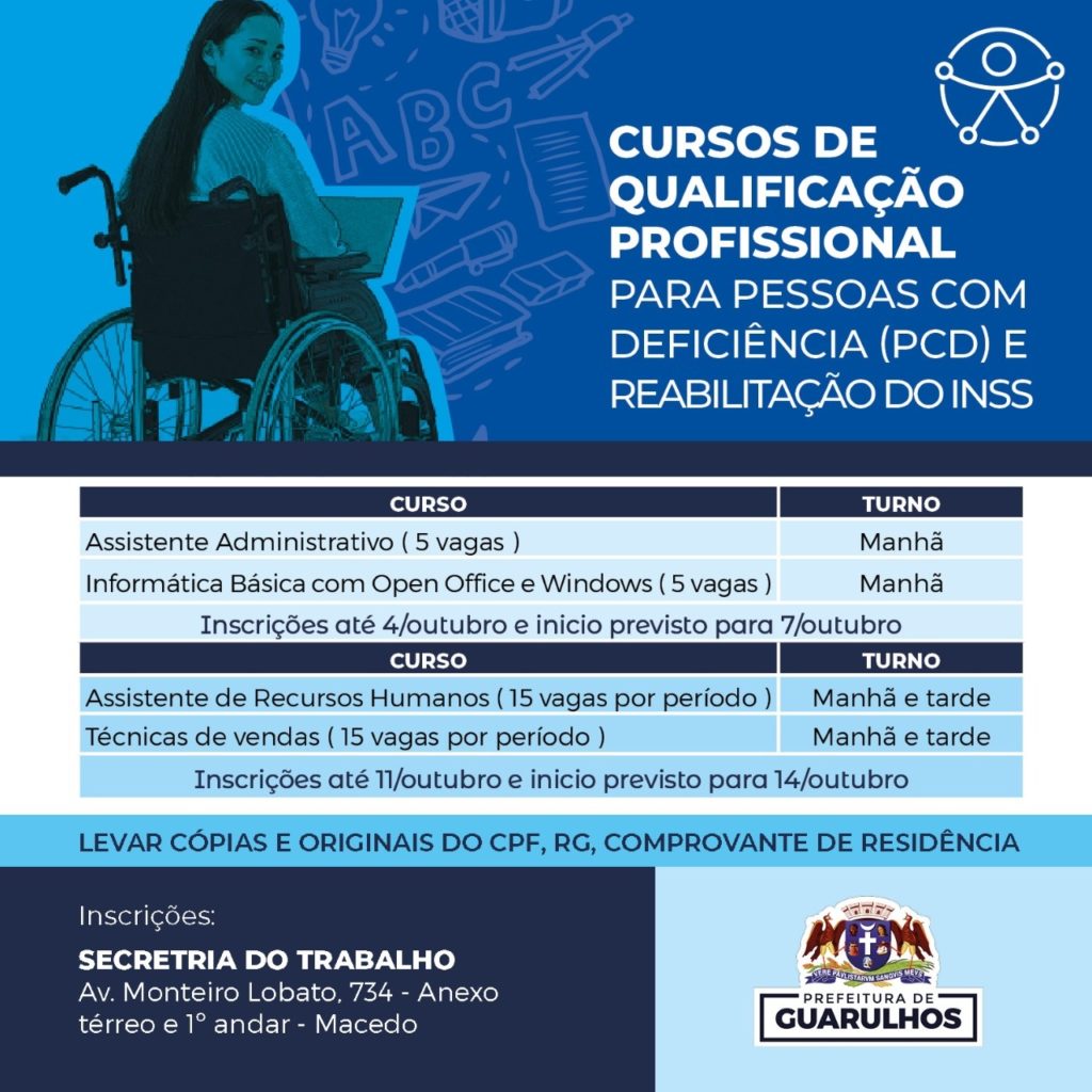 A Prefeitura de Guarulhos, por meio da Secretaria do Trabalho, começou a receber inscrições para cursos de qualificação profissional para pessoas com deficiência (PCD) e reabilitados do INSS (Instituto Nacional do Seguro Social). Os cursos são fruto de uma parceria da Pasta com o governo do Estado de São Paulo.