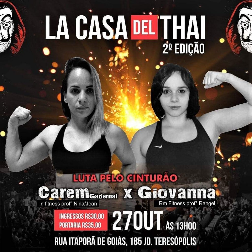 Já a última luta, que será a profissional, terá cinco rounds de dois minutos. Carem Gardenal começou a treinar na modalidade há três anos, sendo mãe de quatro filhos. Já Giovanna, é treinada há quatro meses por Claiton Teixeira, 43, conhecido como professor Tom, que treina na modalidade desde os sete anos, além de revelar o guarulhense Jean Ferreira, que durante o ano passado, ficou 17 lutas sem perder ao disputar os três maiores eventos de Muay Thai na capital paulista.