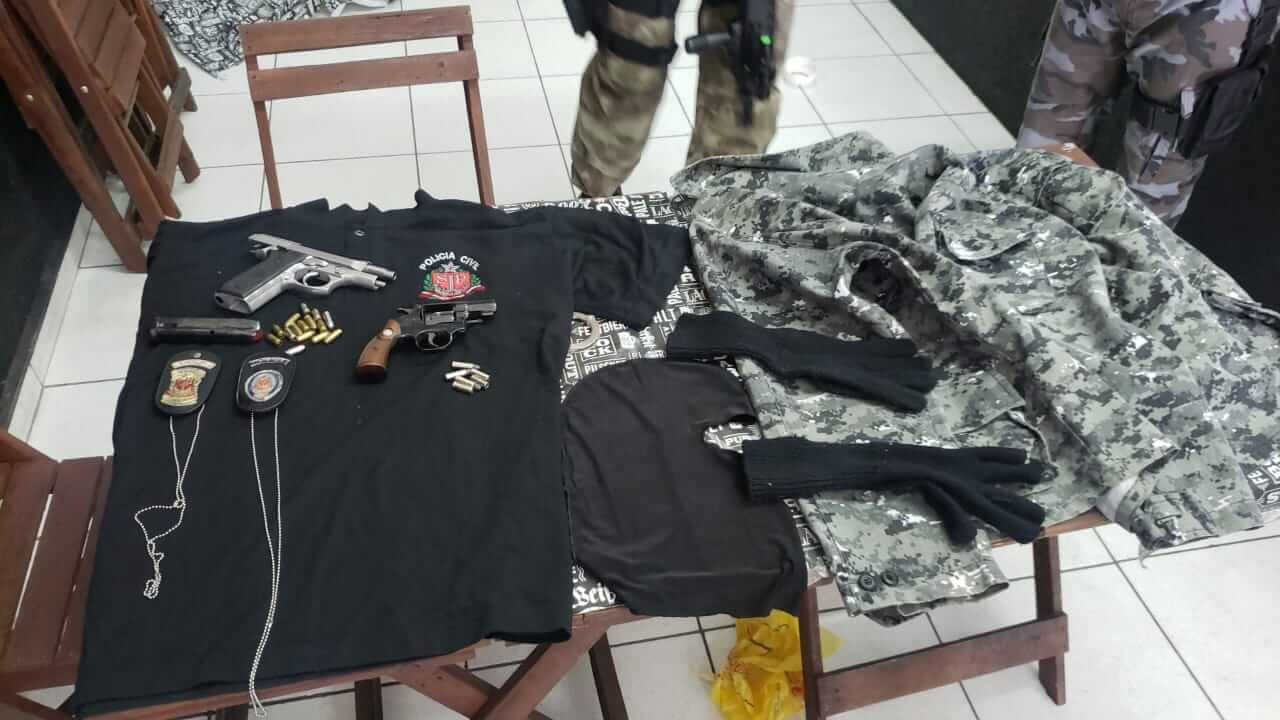 Policiais civis da Divisão de Investigação sobre Entorpecentes (DISE), com o apoio de policiais da Delegacia do Núcleo de Roubo de Cargas e do Grupo Armado de Repressão a Roubos e Assaltos (Garra), prenderam três homens nesta sexta-feira (01), que não tiveram a identidade revelada e apreenderam um revólver e uma pistola, além de roupas e distintivos da Polícia Civil.