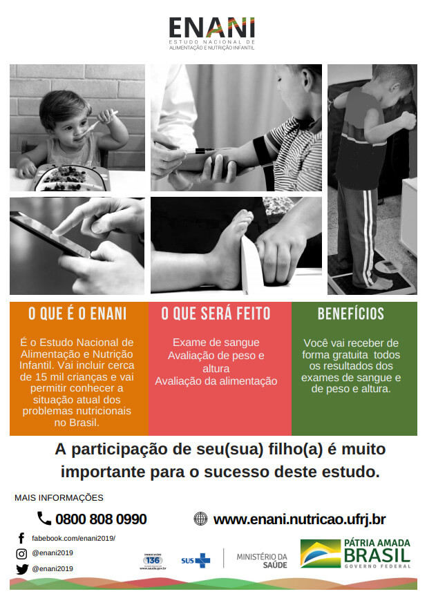 A realização da pesquisa segue rigorosa metodologia científica e foi aprovada pelo Comitê de Ética em Pesquisa com Seres Humanos da UFRJ. Para o coordenador nacional do Enani, o pesquisador Gilberto Kac, um inquérito completo como este trará informações inéditas sobre alimentação infantil e o perfil de deficiência de vitaminas e minerais das crianças brasileiras.