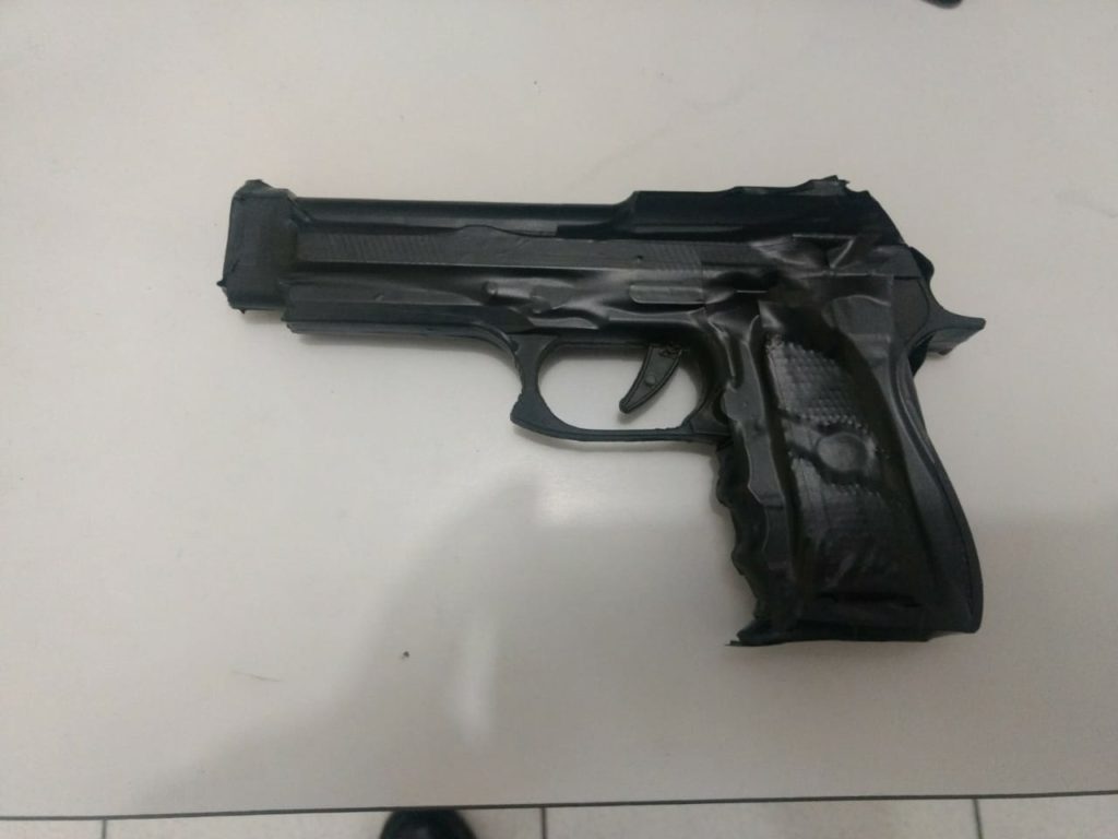 Segundo a PM, durante um patrulhamento de rotina, os policiais desconfiaram de dois indivíduos que seguiam próximo ao estabelecimento comercial. Ao visualizarem a viatura, os suspeitos teriam tentado fugir, porém, acabaram presos. Ao ser questionado pela posse do simulacro, os suspeitos teriam afirmado que iriam roubar um comércio local, de acordo com a polícia.