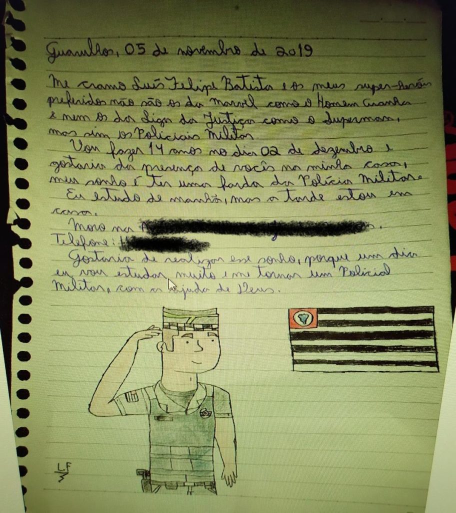O jovem completou 14 anos no dia 02 deste mês. A homenagem será realizada às 15h deste sábado. Na carta enviada para a PM no dia 14 do mês passado, o adolescente descreve que os seus super heróis não são os da Marvel, mas sim, os policiais militares, e com isso, ele pede um uniforme de presente da polícia.