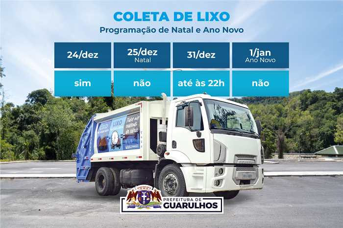 A Prefeitura de Guarulhos informa que, como nos anos anteriores, não haverá coleta de lixo domiciliar nos próximos dias 25, feriado de Natal, e 1º de janeiro de 2020, Dia da Confraternização Universal, ambos quarta-feira.