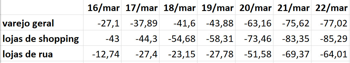 Nas lojas de shopping, o movimento de pessoas na semana de 16 a 22 apresentou diminuições de 71,64% em relação às outras semanas do ano e de 70% frente à mesma semana de 2019. Já nas lojas de rua, as reduções foram de 47,76% e de 49,47% na mesma base de comparação. Retrações se acentuaram a cada dia, mostrando que consumidores se conscientizaram sobre a necessidade do isolamento social.