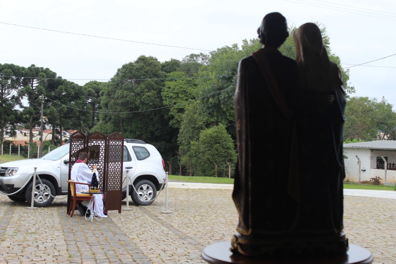 O padre da Paróquia Nossa Senhora Aparecida, no bairro Oxford, em São Francisco do Sul (SC), Fábio Bosco, ganhou repercussão nacional neste período de pandemia do coronavírus por implantar o sistema drive-thru para realizar confissão com os fiéis.