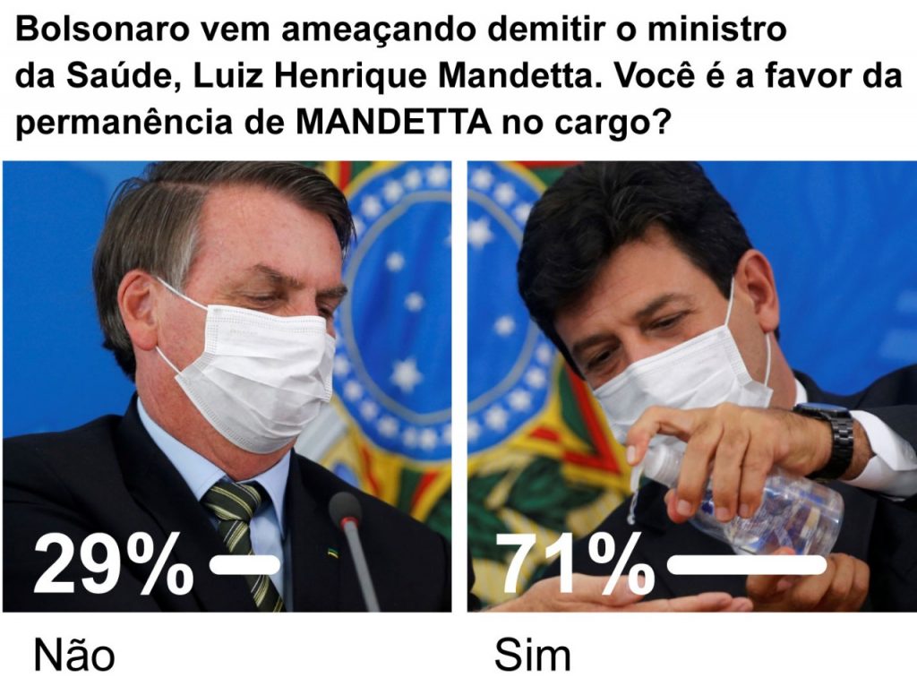 Na resultado da enquete, que se encerrou às 19h30 desta quinta-feira, 71% defendem a permanência de Mandetta no cargo; 29% são contrários.