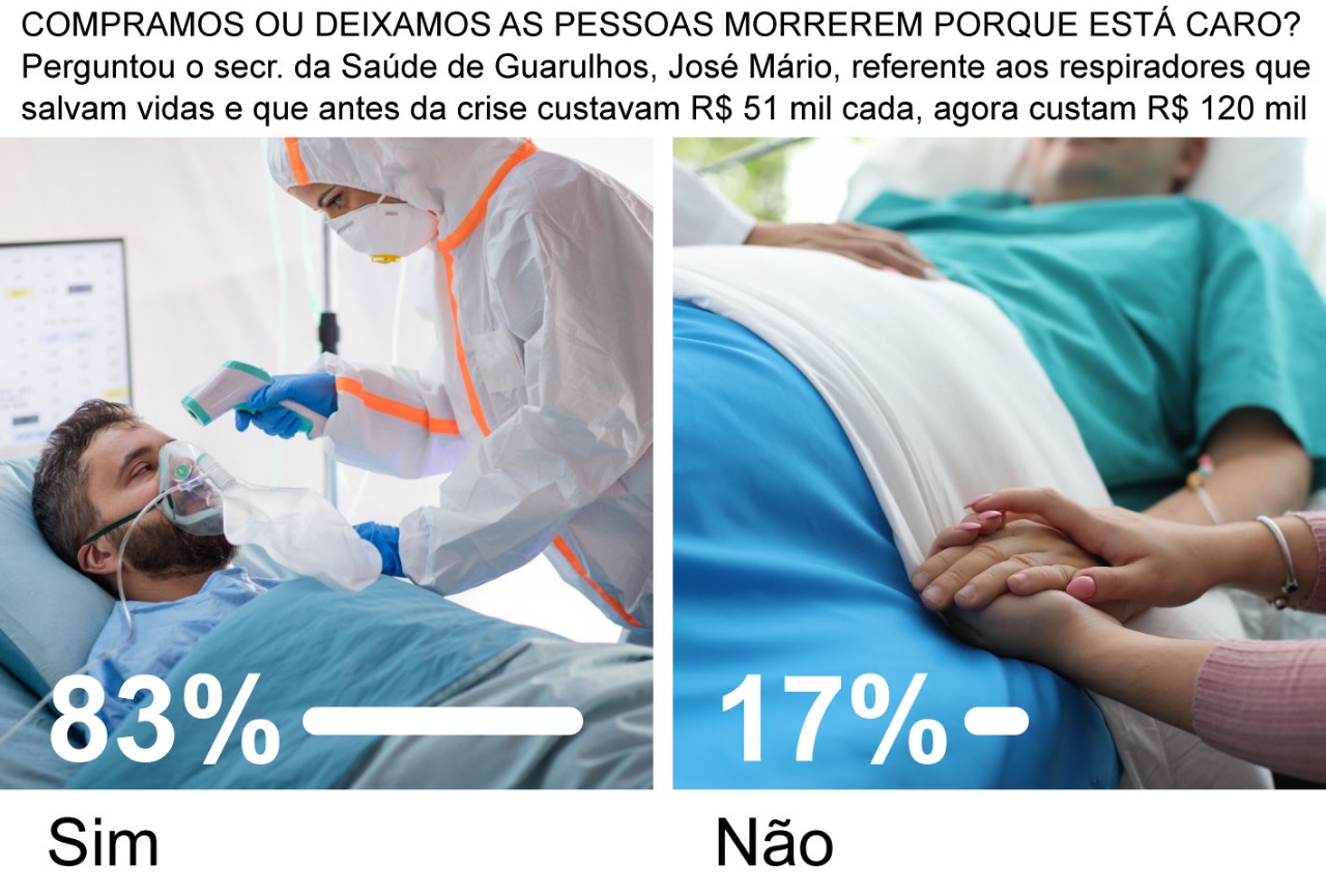 Enquete realizada pelo HOJE no Facebook (@GuarulhosHoje), encerrada na noite desta sexta-feira (17), fez a seguinte pergunta aos internautas: “COMPRAMOS OU DEIXAMOS AS PESSOAS MORREREM PORQUE ESTÁ CARO?”. Perguntou o secretário de Saúde de Guarulhos, José Mario, referente aos respiradores que salvam vidas e que, antes da crise, custavam R$ 51 mil cada um, agora custam R$ 120 mil – SIM ou NÃO”.