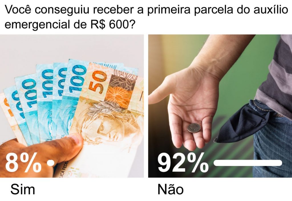 A reclamação de inúmeras pessoas que não conseguiram receber a primeira parcela do auxílio emergencial de R$ 600, se confirmou na enquete do HOJE no Facebook (@GuarulhsHoje), que se encerrou neste domingo (19). Dos participantes, 92% disseram não ter recebido o benefício do governo federal. Por outro lado, apenas 8% afirmaram ter tido acesso ao auxílio emergencial.
