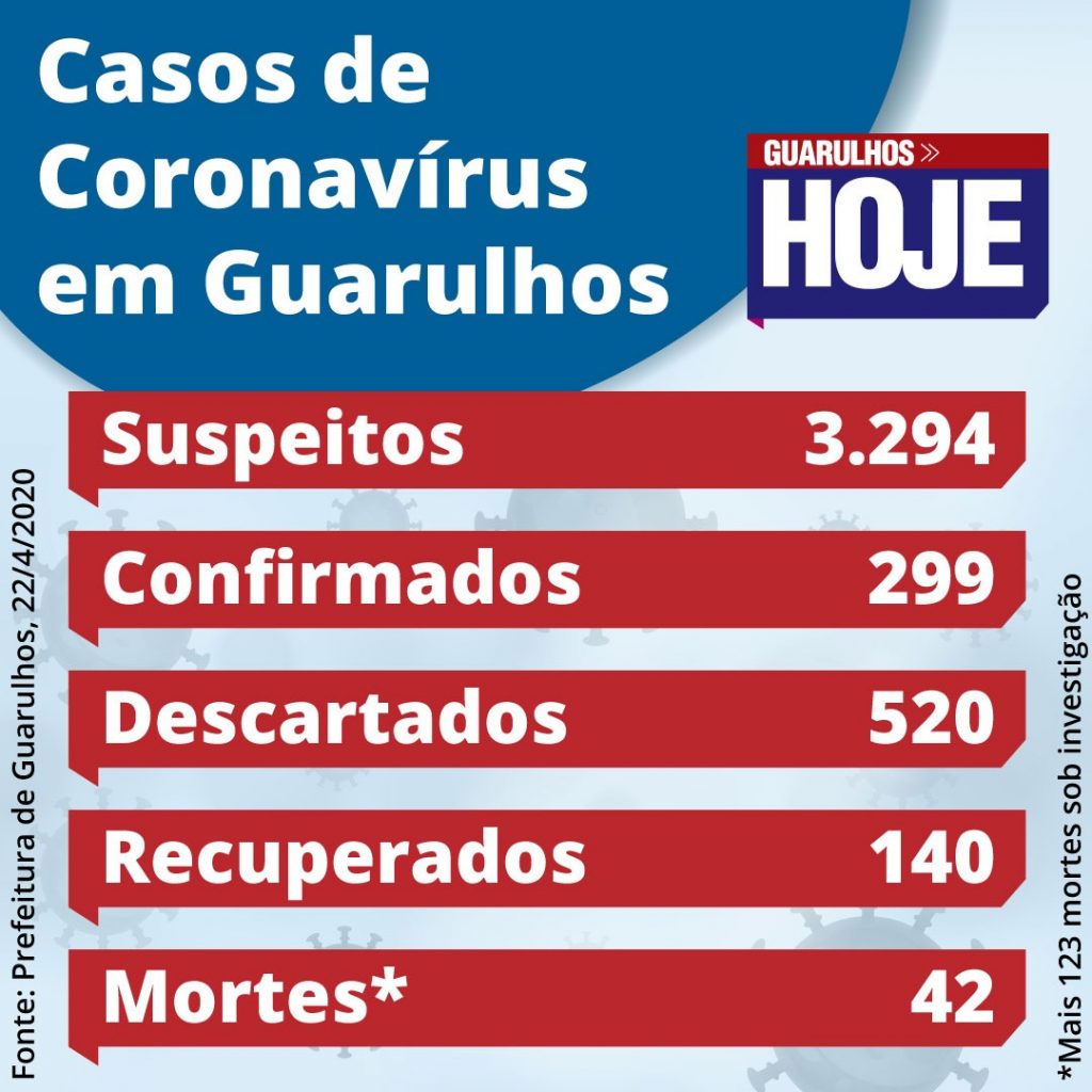 De acordo com o boletim epidemiológico da Secretaria Municipal da Saúde divulgado nesta quarta-feira (22), Guarulhos registra 42 mortes confirmadas por coronavírus desde o início na pandemia. São cinco mortes a mais do que o número divulgado na véspera de feriado, dia 20. Dos novos óbitos, dois são do sexo masculino, ambos de 55 anos, e três do feminino, de 49, 79 e 87 anos. Outras 60 mortes seguem em investigação.