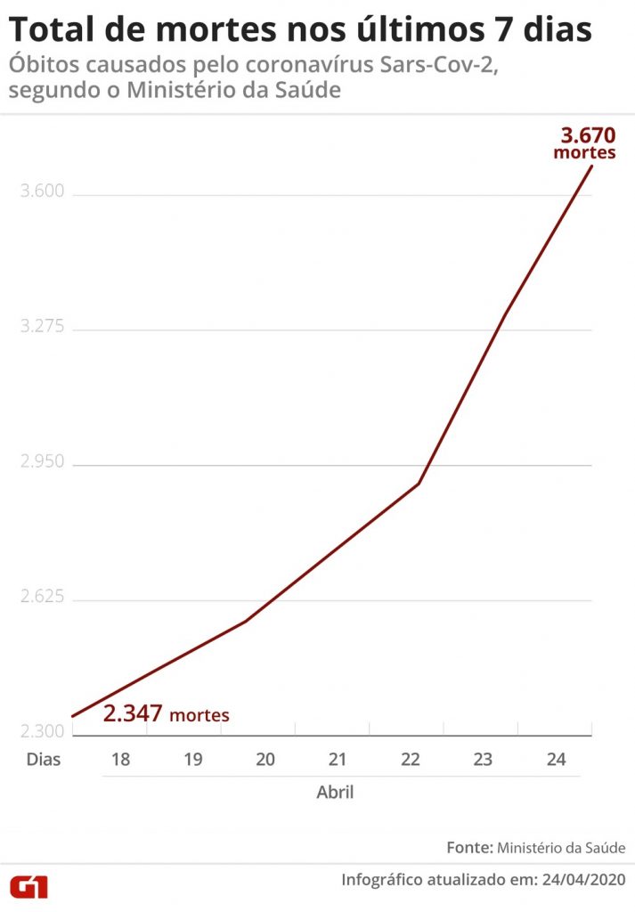 O Ministério da Saúde divulgou nesta sexta-feira (24) o mais recente balanço dos casos de coronavírus no Brasil. Os principais dados são: