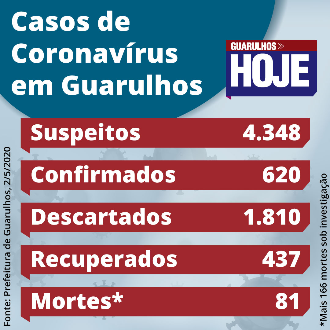 A cidade de Guarulhos contabiliza neste sábado (2) 81 mortes confirmadas por Covid-19, um aumento de 19% desde a última quinta-feira (30), quando o número de vítimas da doença era 68. São 26 óbitos ainda em investigação dos 166 suspeitos e outros 59 foram descartados. Dos 13 óbitos confirmados nos últimos dois dias, nove são de homens entre 45 e 90 anos e quatro de mulheres entre 51 e 80 anos.
