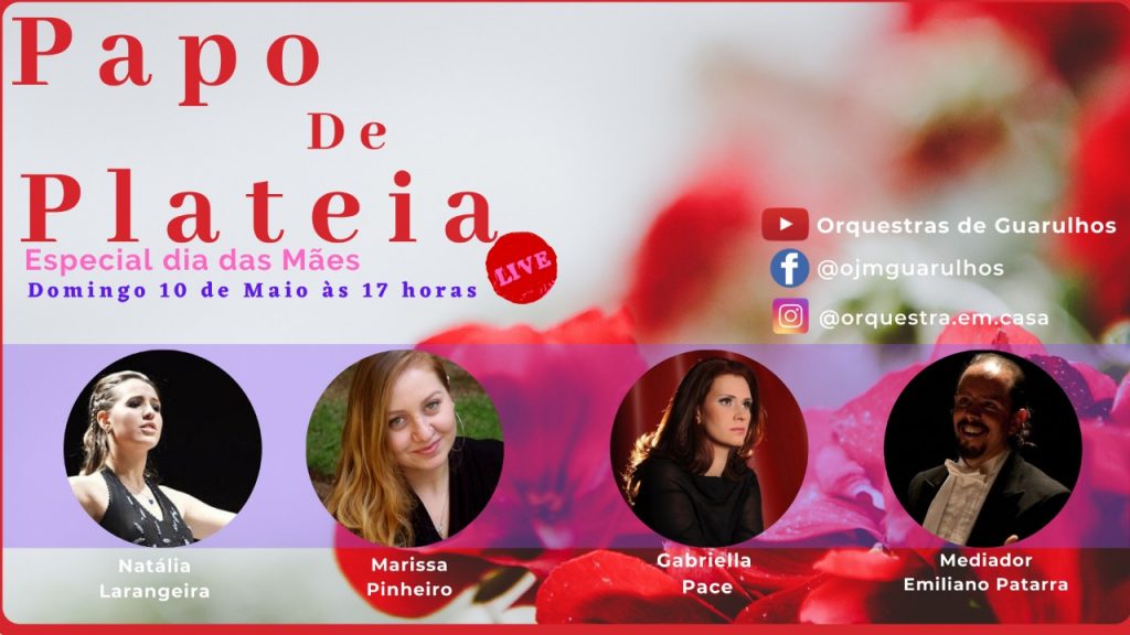 No próximo domingo (10), às 17h, o Papo de Plateia Live apresenta o especial do Dia das Mães em um bate-papo com musicistas que também são mães. Iniciativa da Prefeitura de Guarulhos por meio da Secretaria de Cultura, o Papo de Plateia Live é transmitido pelas redes sociais das orquestras de Guarulhos no YouTube, no endereço https://www.youtube.com/channel/UCS9r_T3pJEr2wnZreRGSo1g, no Facebook https://www.facebook.com/ojmguarulhos/ e no Instagram https://www.instagram.com/orquestra.em.casa/.