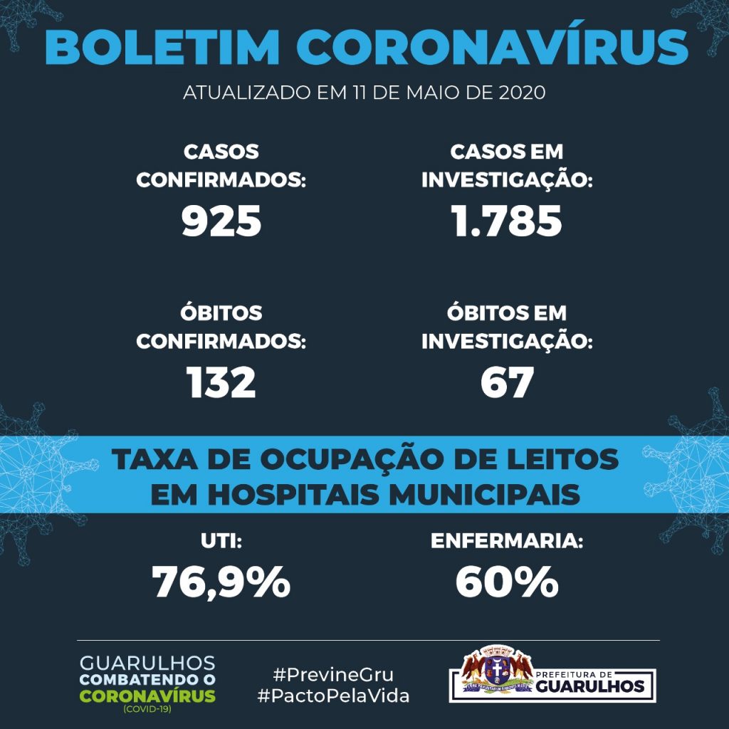 O Boletim Epidemiológico divulgado nesta segunda-feira (11) pela Secretaria Municipal da Saúde registra que 132 mortes por coronavírus (Covid-19) foram confirmadas em Guarulhos. São seis óbitos a mais que sábado, sendo quatro homens com idades entre 39 e 64 anos e duas mulheres com 66 e 75 anos. Há ainda 67 que seguem em investigação. Dos 5.050 casos notificados, 925 foram confirmados, 2.340 descartados e 1.785 estão sob investigação.