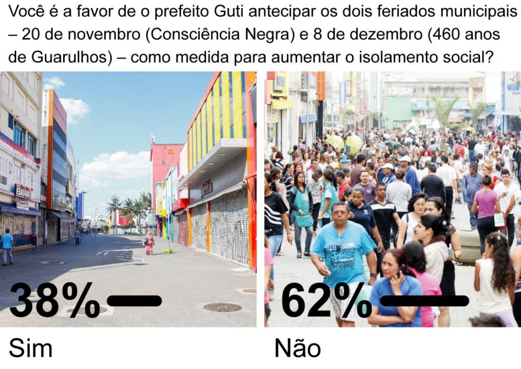 O resultado da enquete, que teve a participação de 10 mil pessoas, mostrou que 62% se mostraram contrários ao antecipar os feriados de 20 de novembro (Dia da Consciência Negra) e 8 de dezembro (460 anos de Guarulhos) por conta da pandemia; já 38% dos participantes se mostraram favoráveis.