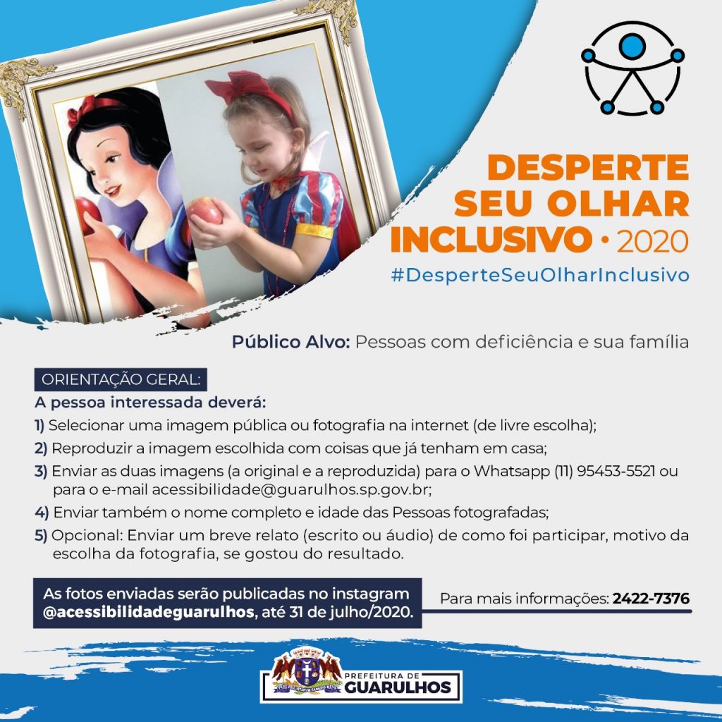 A Prefeitura de Guarulhos promove mais uma edição do Desperte seu Olhar Inclusivo, ação interativa para que pessoas com deficiência (PCD) possam se transformar em seus personagens favoritos de filmes, desenhos, obras de artes ou o que quiserem ser através da criatividade e da fotografia.