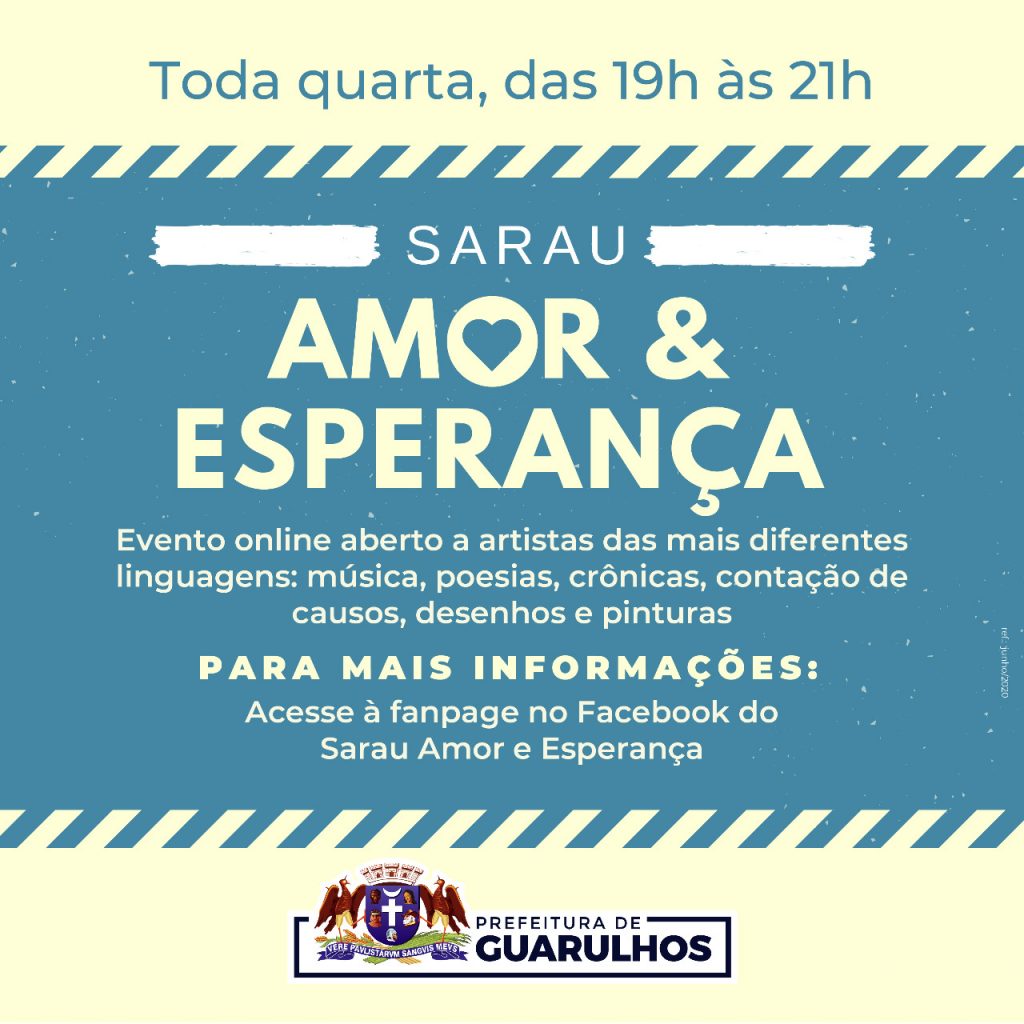 Toda quarta-feira, sempre das 19h às 21h, a Prefeitura de Guarulhos apresenta o Sarau Amor e Esperança, veiculado pela fanpage do evento no Facebook, disponível em https://www.facebook.com/Sarau-amor-e-esperan%C3%A7a-102829921406683/. Iniciativa da Secretaria de Cultura e da Casa de Cultura Popular São Rafael, o sarau tem como objetivo proporcionar cultura aos participantes e desenvolvimento para artistas iniciantes. A participação é livre.