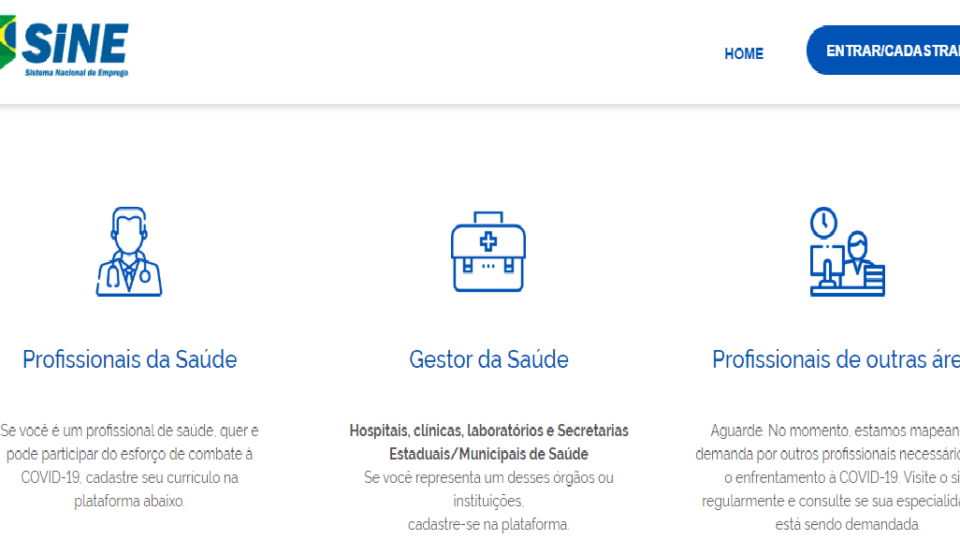 O governo lançou nesta terça-feira, 2, uma plataforma virtual chamada Sine Saúde para facilitar o preenchimento de vagas de emprego na área de saúde. O objetivo é criar uma ponte entre profissionais de saúde que buscam trabalho e instituições ou órgãos públicos que precisam contratar para reforçar o pelotão de frente no combate à pandemia do novo coronavírus.