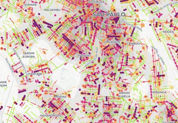 A concentração de covid-19 é representada no mapa por pequenas ilhas de calor que viram linhas na medida em que o recorte vai sendo aproximado para vizinhanças. Em geral, as manchas aparecem espalhadas praticamente por todo a cidade, exceto na região mais extrema da zona sul, uma das mais pobres de São Paulo, onde há mais ocorrências de subnotificação do que de casos confirmados, pela ferramenta.
