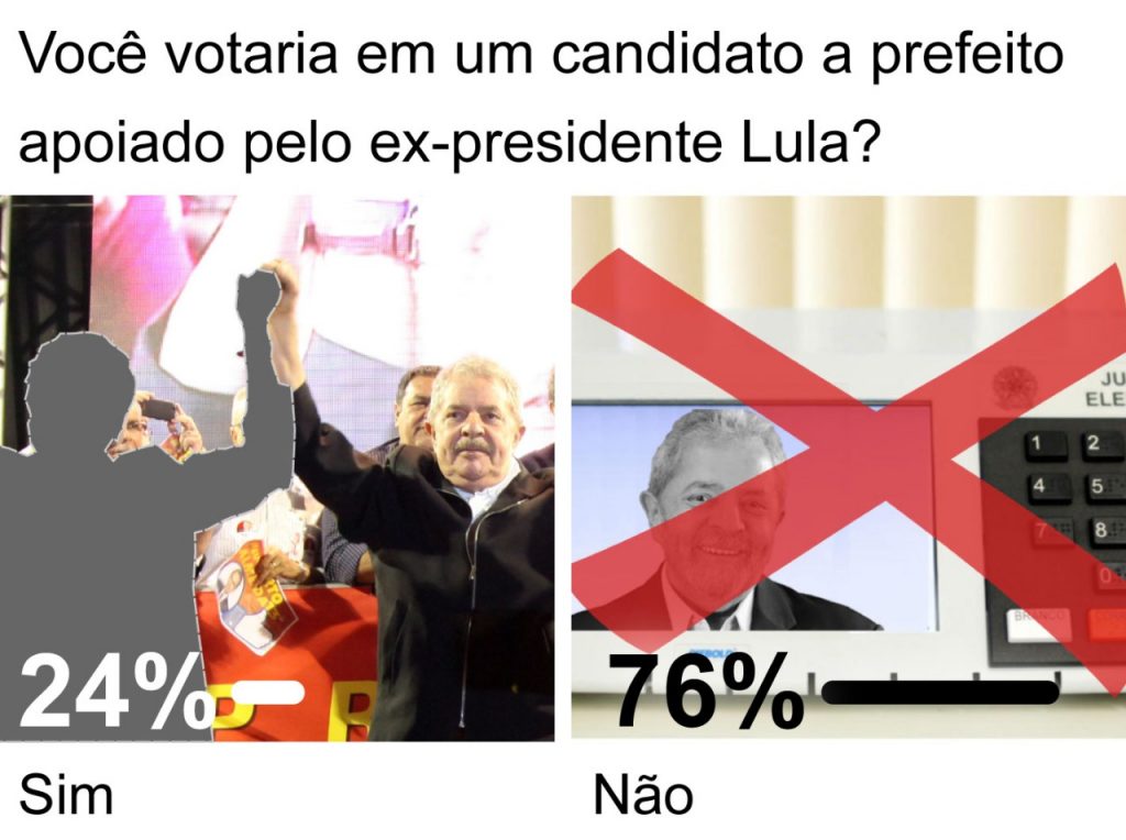 Delas, 76%, ou 2,2 mil votos, responderam “não” à pergunta: “Você votaria em um candidato a prefeito apoiado pelo ex-presidente Lula?”. Os que responderam que apoiariam um provável candidato com o apoio do petista somaram 24%, ou 729 votos.