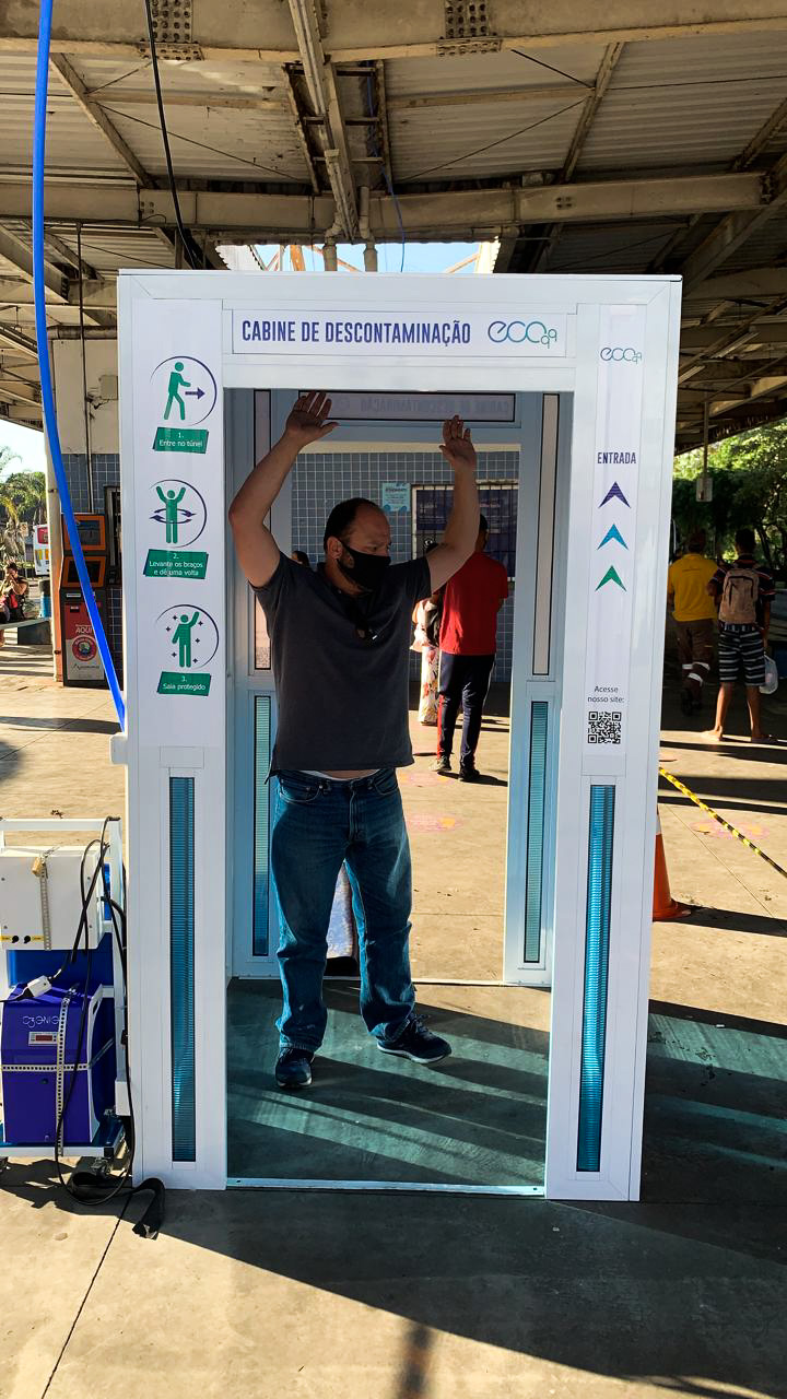 Mais uma medida para frear a propagação do coronavírus no transporte público de Guarulhos foi tomada pela Secretaria de Transportes e Mobilidade Urbana nesta segunda-feira (22): a instalação no Terminal Pimentas de uma cabine de descontaminação, utilizada para desinfecção de pessoas antes da entrada em qualquer local fechado, como o transporte público.