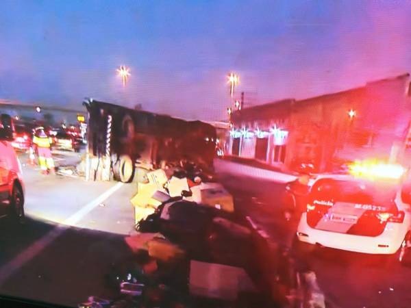 Um dos veículos acabou tombando e causou um congestionamento na rodovia. O caminhão foi destombado, mas o bloqueio foi mantido para limpeza da via. O motorista encontra congestionamento até o km 227.
