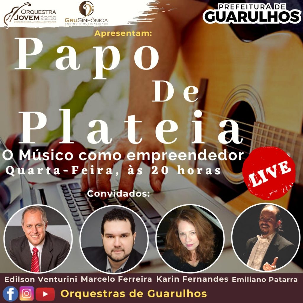 O Papo de Plateia Live desta quarta-feira (1º), às 20h, discute a relação dos músicos com a venda de seu trabalho e as estratégias encontradas por instrumentistas para abrir espaço no mercado profissional. Iniciativa da Prefeitura de Guarulhos por meio da Secretaria de Cultura, o evento é transmitido pelas redes sociais das orquestras de Guarulhos no YouTube (https://www.youtube.com/channel/UCS9r_T3pJEr2wnZreRGSo1g), no Facebook (https://www.facebook.com/ojmguarulhos/) e no Instagram (https://www.instagram.com/orquestra.em.casa/).