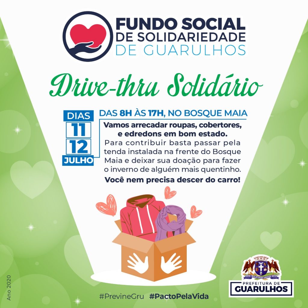 Guarulhos promove neste fim de semana, dias 11 e 12, das 8h às 17h, o Drive-Thru Solidário no Bosque Maia para arrecadar roupas, agasalhos, cobertores, edredons e sapatos em bom estado. A iniciativa da Prefeitura, por meio do Fundo Social de Solidariedade, visa a receber doações da população e de empresas para a Campanha do Agasalho 2020.