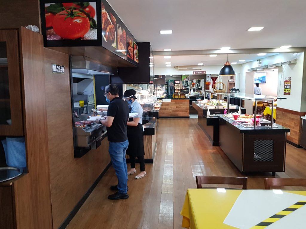 “Tudo o que está sendo exigido nesta reabertura estamos cumprindo. Todo cliente que optar por se servir no modelo self service precisa usar a luva. Não tivemos nenhuma demissão e espero que não tenha, até por que ficamos fechamos por quatro meses e o drive-thru não deu certo. Vendíamos apenas 20 marmitas por dia”, disse Daiane Maciel, gerente do restaurante Forno e Fogão.