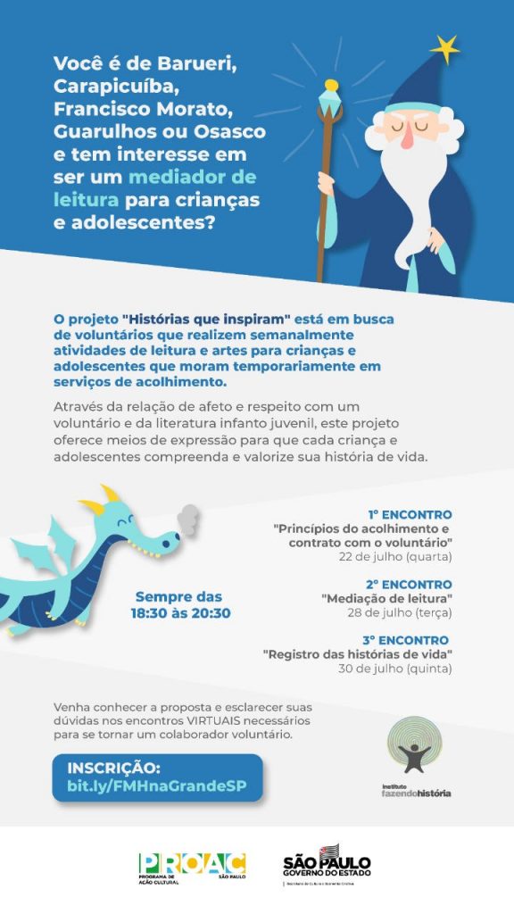 No município, o projeto se chama “Formação Fazendo Minha História” e visa a resgatar a história de cada criança e jovem através da relação de respeito e afeto com o voluntário e a literatura infanto-juvenil. Já no âmbito estadual a proposta é denominada “Histórias que Inspiram”. As inscrições para a capacitação de interessados podem ser feitas por meio do link bit.ly/FMHnaGrandeSP.