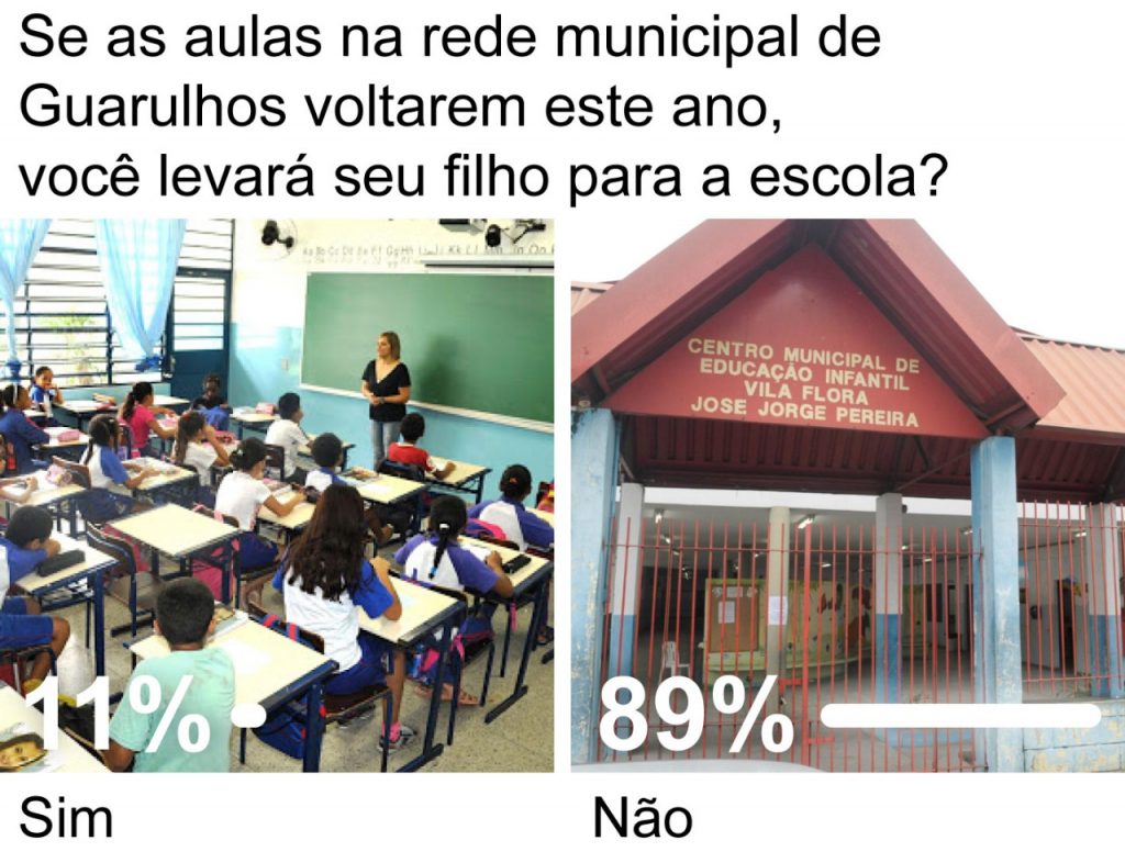 Enquete realizada pelo HOJE em sua página no Facebook (@GuarulhosHoje) sobre a retomada das aulas na rede municipal de Guarulhos apontou que a maioria dos internautas respondeu “Não” à pergunta: “Se as aulas na rede municipal de Guarulhos voltassem este ano, você levaria seu filho para a escola?”.