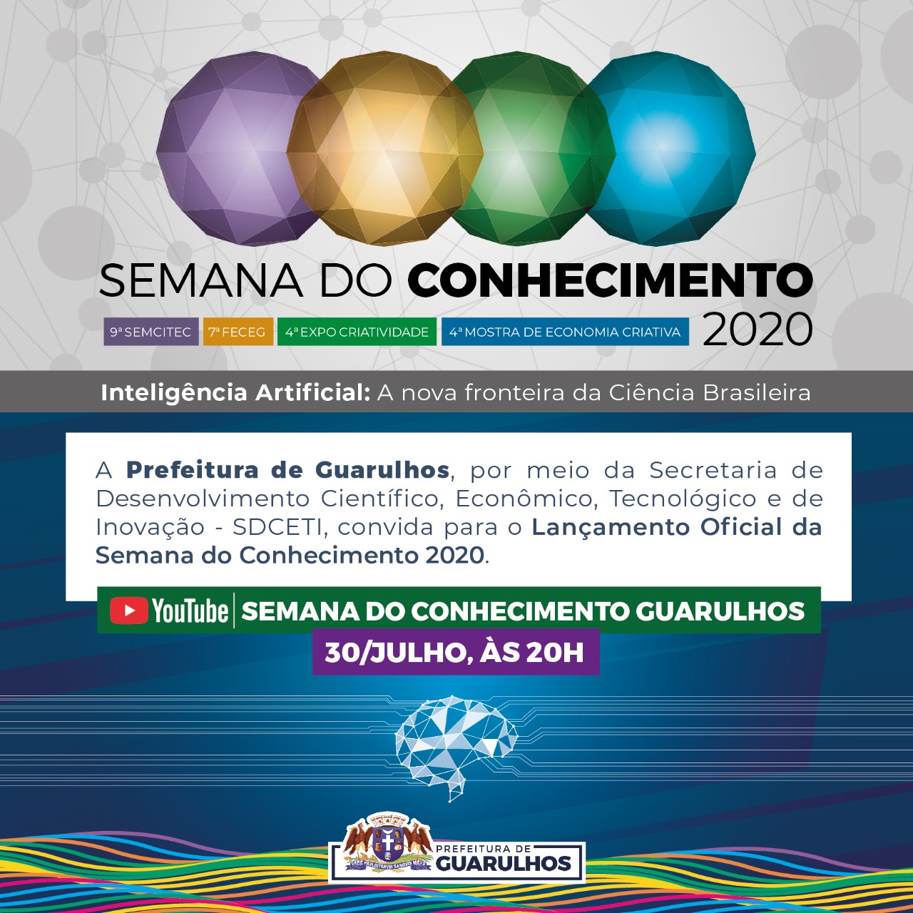 Com o tema “Inteligência artificial: a nova fronteira da ciência brasileira”, a Semana do Conhecimento 2020 acontecerá de forma virtual no mês de outubro em razão da pandemia do coronavírus. O seu lançamento oficial acontece nesta quinta-feira (30), às 20h, no canal da Semana do Conhecimento no YouTube (https://www.youtube.com/channel/UCIzEoyoQ2JrQHklmJQ7ldCw), com a participação online do secretário de Desenvolvimento Científico, Econômico, Tecnológico e de Inovação de Guarulhos, William Paneque, de coordenadores e instituições que colaboram com o evento.