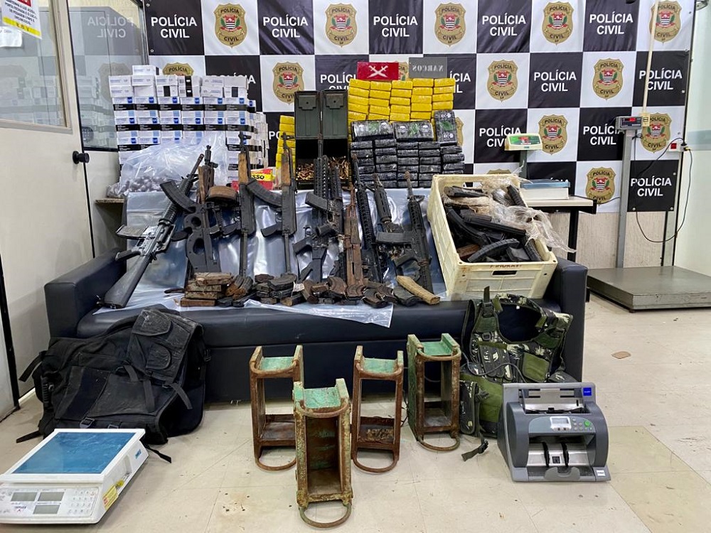 Na garagem, os agentes localizaram uma parede oca e um dispositivo, próximo ao interruptor de luz, que ao ser acionado abriu um compartimento na parede onde foram localizados 11 fuzis, mil munições de diversos calibres, balança digital, dois coletes balísticos, formas de prensas, máquina para contagem de dinheiro, diversos medicamentos controlados e mais tijolos de cocaína.