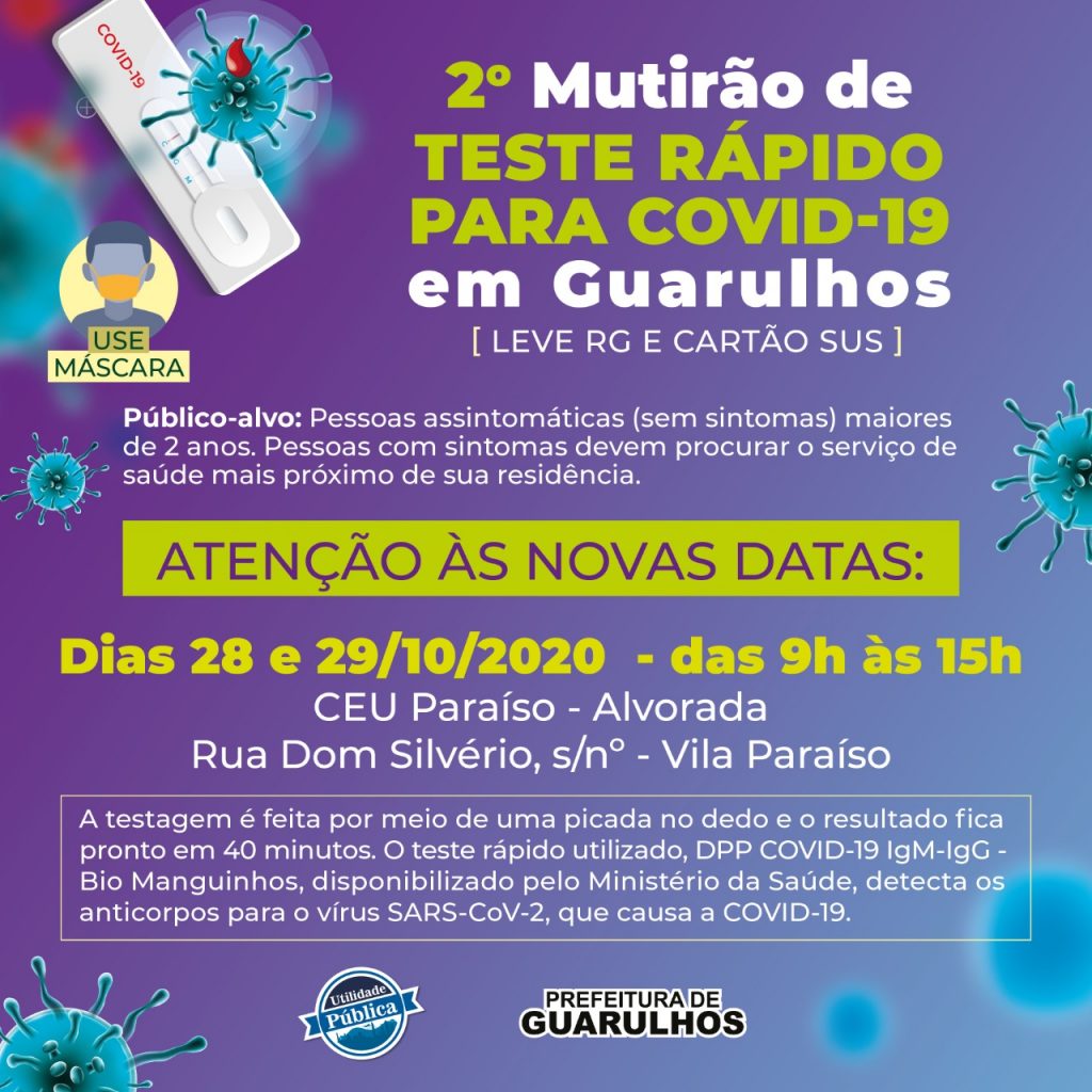 Será antecipado para esta quarta e quinta-feira (28 e 29), o mutirão de testes rápidos para o diagnóstico da Covid-19 no CEU Paraíso/Alvorada, que fica na rua Dom Silvério, s/nº (Vila Paraíso). A testagem no local, que seria realizada nos dias 29 e 30, mudou de data em virtude do feriado do Servidor Público (28 de outubro), cujo ponto facultativo será na sexta-feira (30). O atendimento será mediante a distribuição de senhas, das 9 às 15 h, e a entrada das pessoas será pela Escola Municipal de Ensino Fundamental Anísio Teixeira, que fica ao lado do CEU.