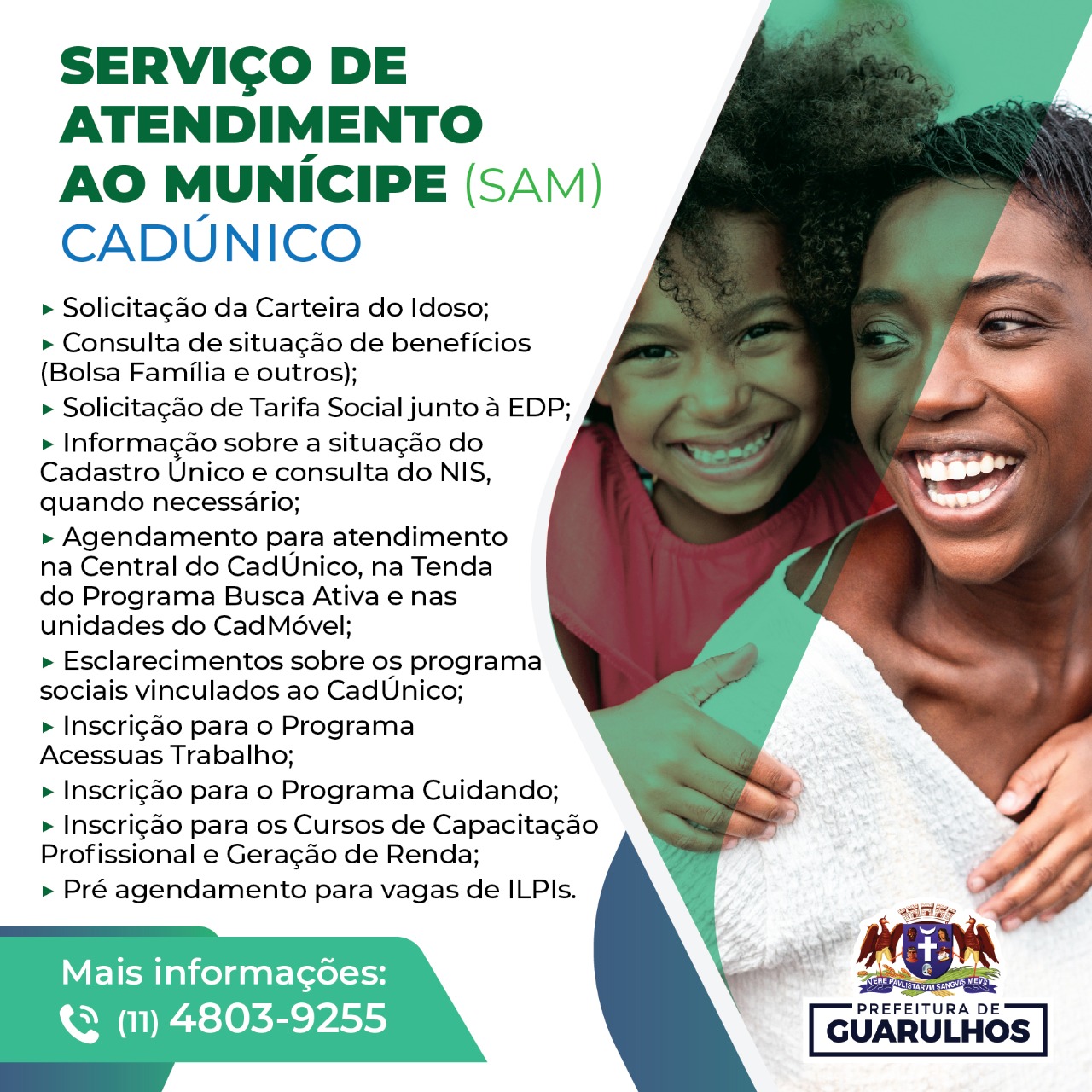 A população guarulhense conta desde novembro com o Serviço de Atendimento ao Munícipe (SAM) CadÚnico para informar sobre diversos programas e serviços oferecidos pela Secretaria de Desenvolvimento e Assistência Social (SDAS). Trata-se de uma da central de atendimento telefônico ([11] 4803-9255) que funciona de segunda a sexta-feira, das 8h às 17h.