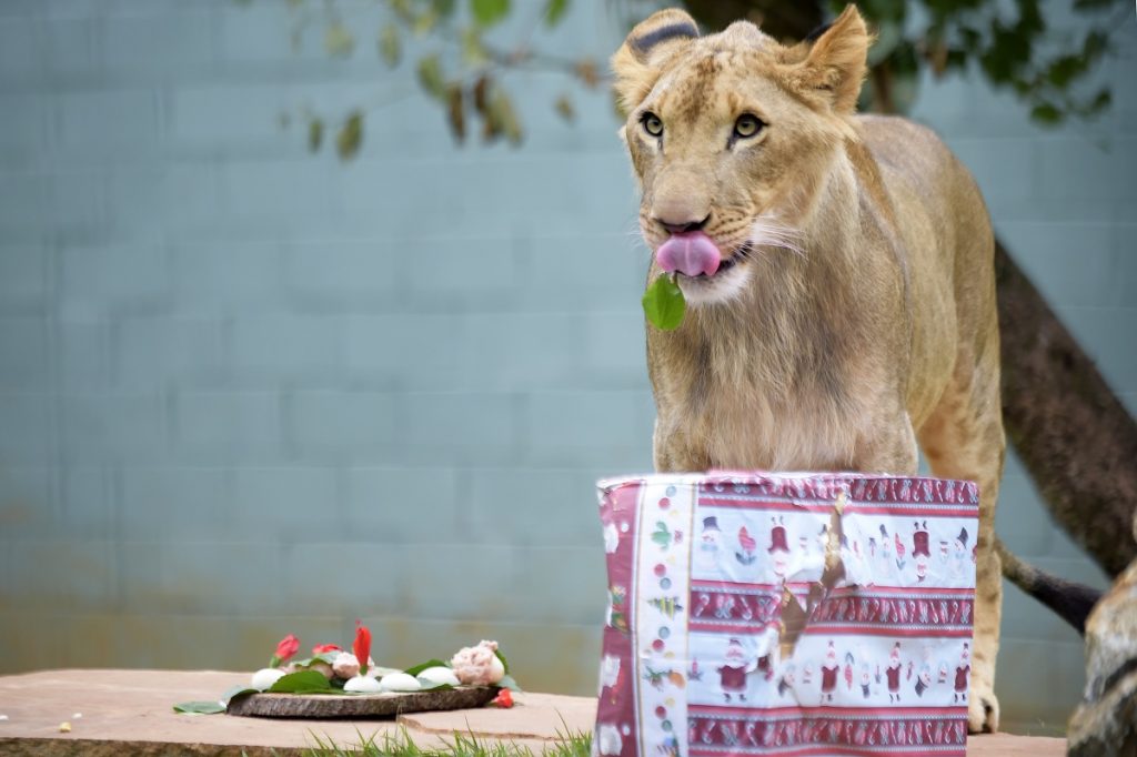 Para marcar a data, o felino ganhou bolo de frango decorado com ovos e flores de hibisco, muitas caixas embrulhadas com papel de presente e recheadas com serragem, e também uma faixa com os dizeres “Feliz Aniversário, Madiba”. Tanto o bolo como os presentes não duraram muito diante da curiosidade dos leões que logo se interessaram pelas novidades e brincaram muito, sob os olhares encantados da platéia.