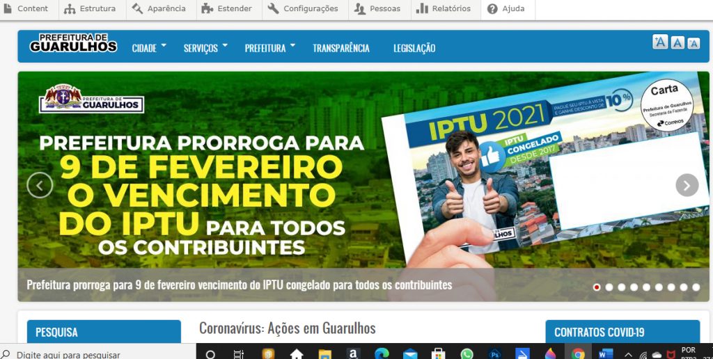 O boleto da primeira parcela ou pagamento integral do Imposto Predial e Territorial Urbano (IPTU) 2021 de Guarulhos, com vencimento prorrogado para 9 de fevereiro, pode ser acessado apenas por meio da versão online, disponível na opção “segunda via de tributos” no link fazenda.guarulhos.sp.gov.br. O prazo das demais parcelas segue o apresentado nos carnês e no site.